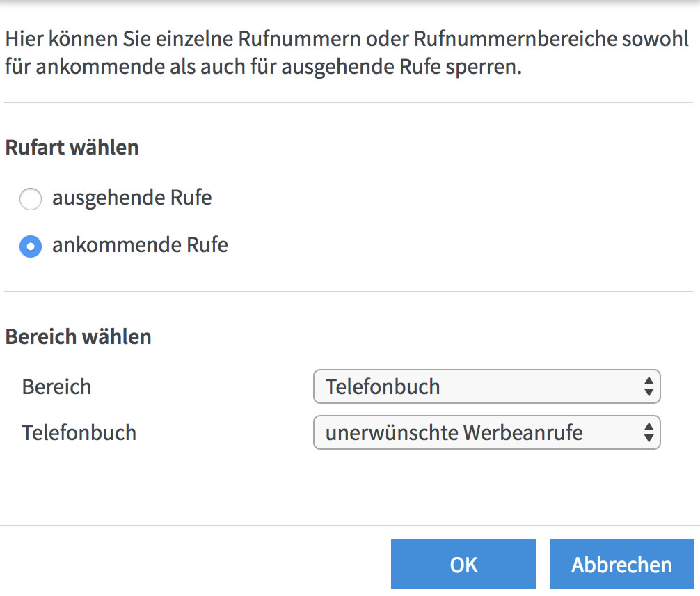 Auswahl eines Telefonbuchs als Sperre für ankommende Anrufe