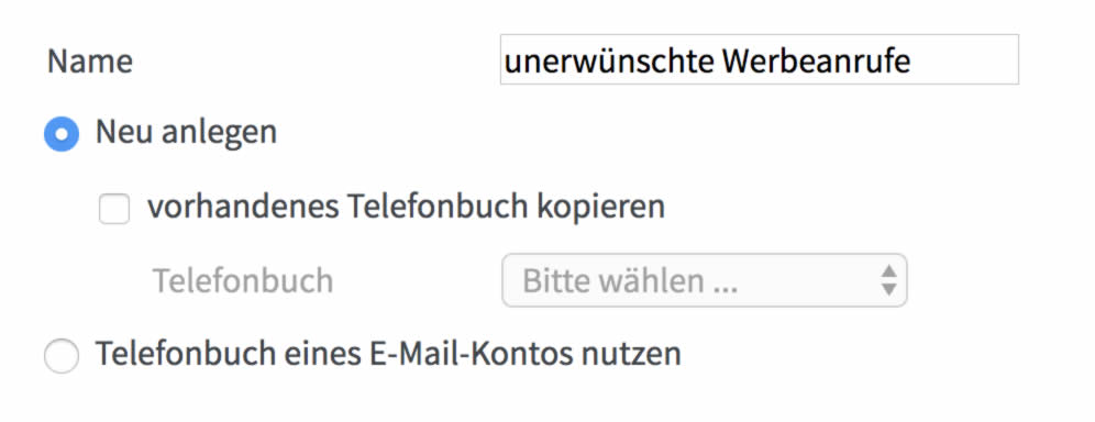 Telefonbuch: Name des Telefonbuches, das die Nummern beinhaltet, von denen Sie keine Anrufe mehr wünschen.