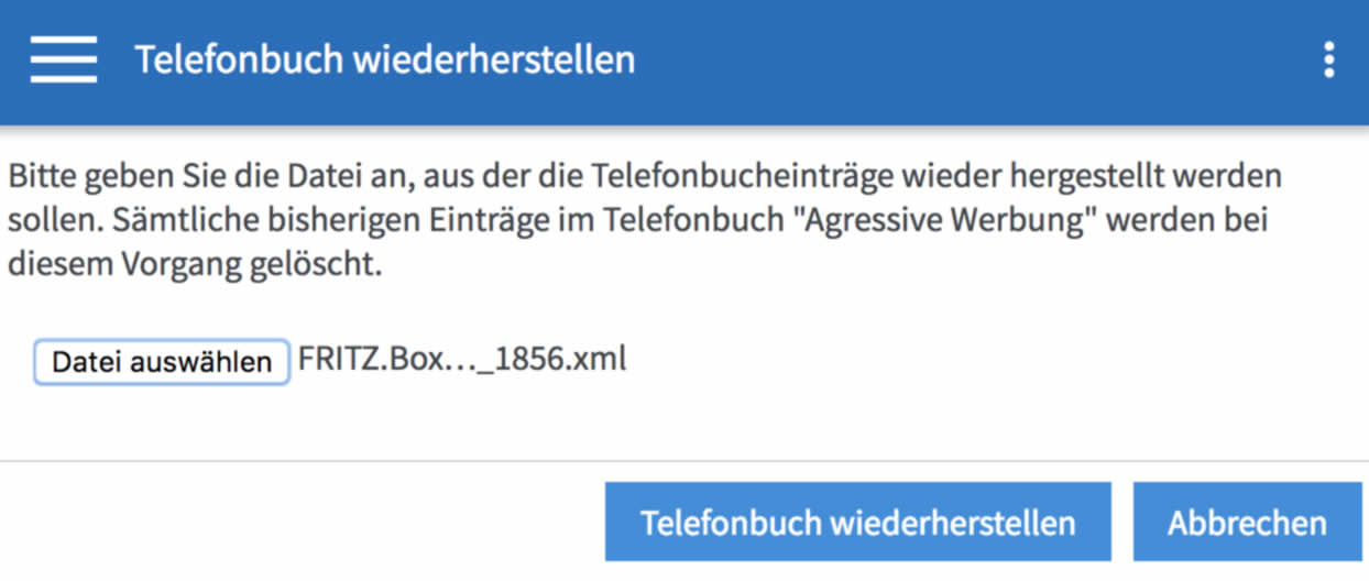Wählen Sie über die Schaltfläche Datei auswählen die zuvor auf Ihrem PC gespeicherte Rufnummernsperrliste aus und klicken Sie die Schaltfläche Telefonbuch wiederherstellen.